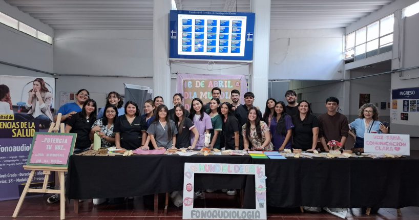 En el marco del Día Mundial de la Voz, el pasado 16 de abril, estudiantes de tercer año de la Licenciatura en Fonoaudiología de la UCSE realizaron una actividad de concientización organizada desde la cátedra de Salud Pública. Bajo el lema “Potenciá tu voz”, instalaron un stand informativo en el hall central de la universidad, donde compartieron recomendaciones para una adecuada higiene vocal y brindaron detalles sobre los factores que pueden generar trastornos de la voz.