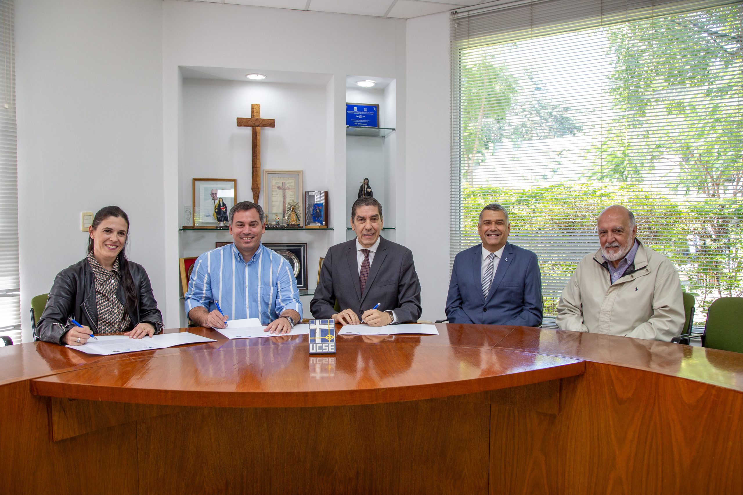 El acuerdo fue firmado por el rector de la UCSE, Ing. Luis Eugenio Lucena, junto a los representantes de las empresas internacionales, Lic. Pablo Hourcade y Melisa Silacci. Del acto también participaron el decano de la Facultad de Ciencias para la Innovación y el Desarrollo, Arq. José Samez, y el referente de la carrera de Ingeniería en Electrónica, Ing. Octavio Medici.
